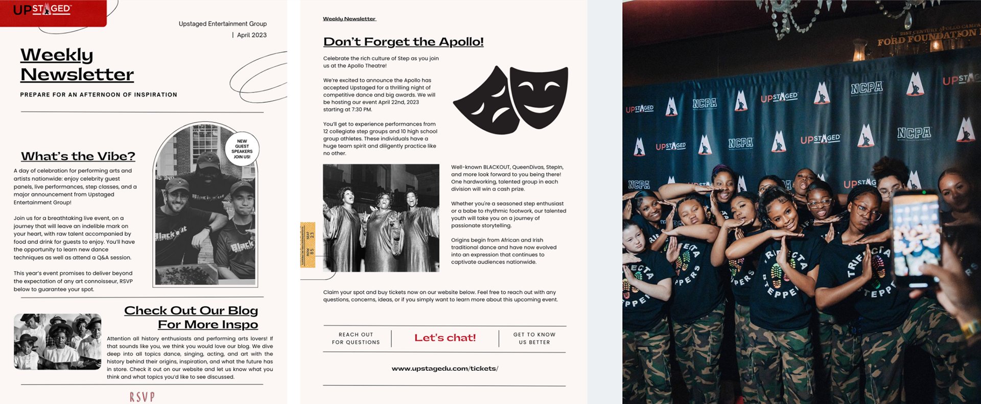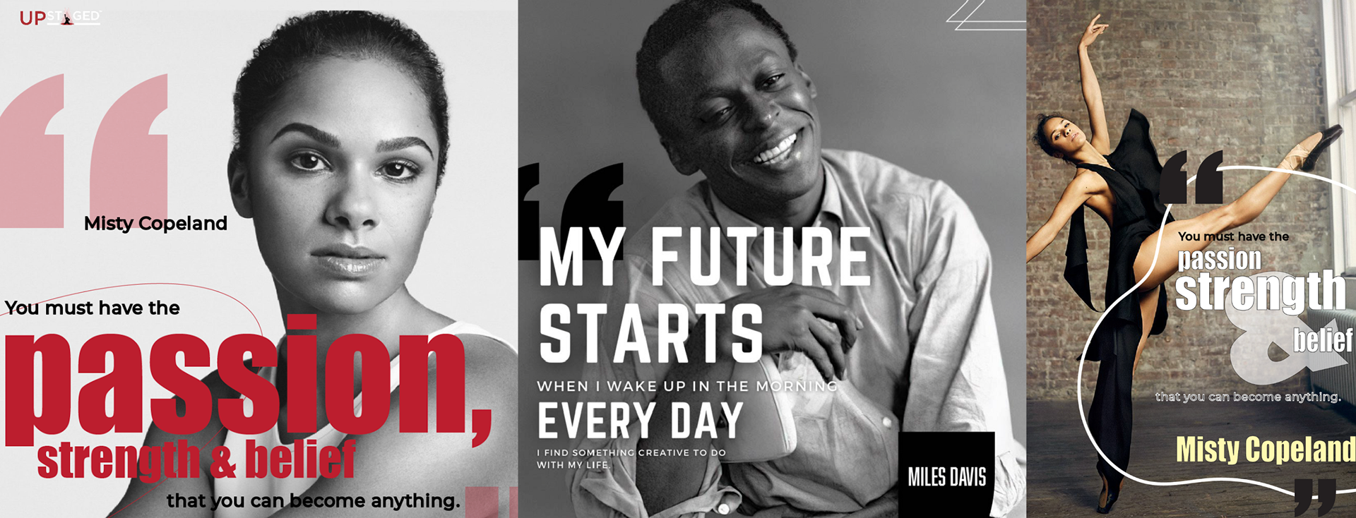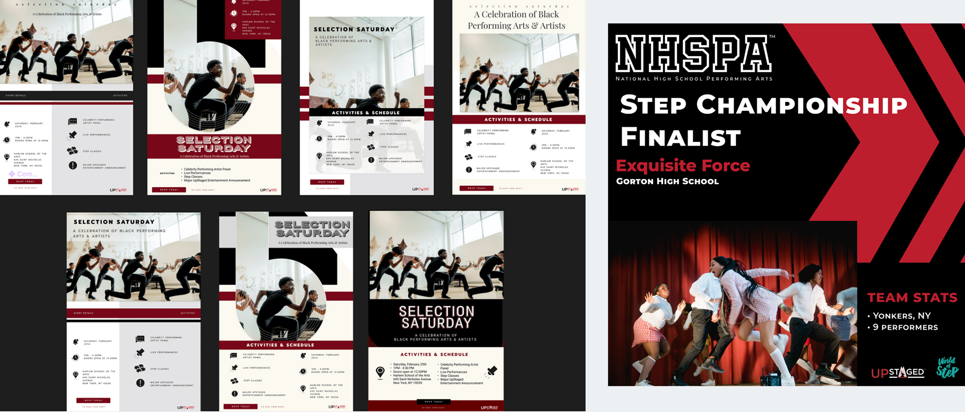 designs ranging from social media posts, posters, newsletters, and event collateral in the Performing Arts & Sports industry with NYFW and The Apollo